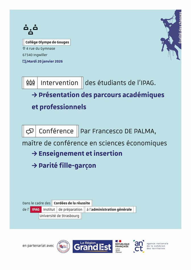 Mardi 20 janvier, Nicolas Paris, responsable du programme, ainsi que des tuteurs de l’IPAG interviendront auprès des collégiens du collège Olympe de Gouges à Ingwiller.