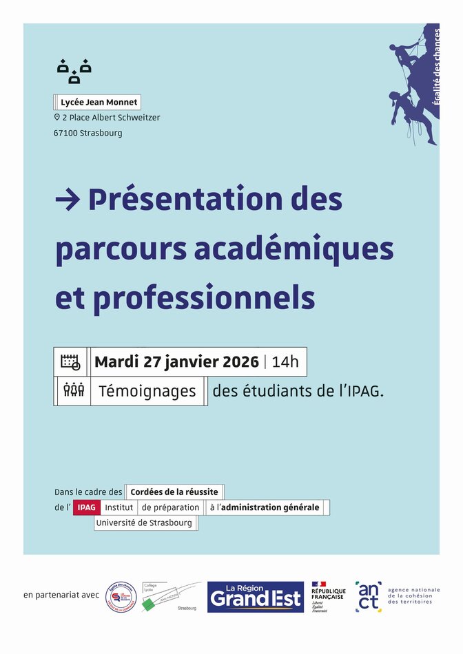 Dans le cadre du dispositif d'Égalité des chances, des étudiants et étudiantes de l’IPAG se rendront au lycée Jean Monnet le mardi 27 janvier 2026.